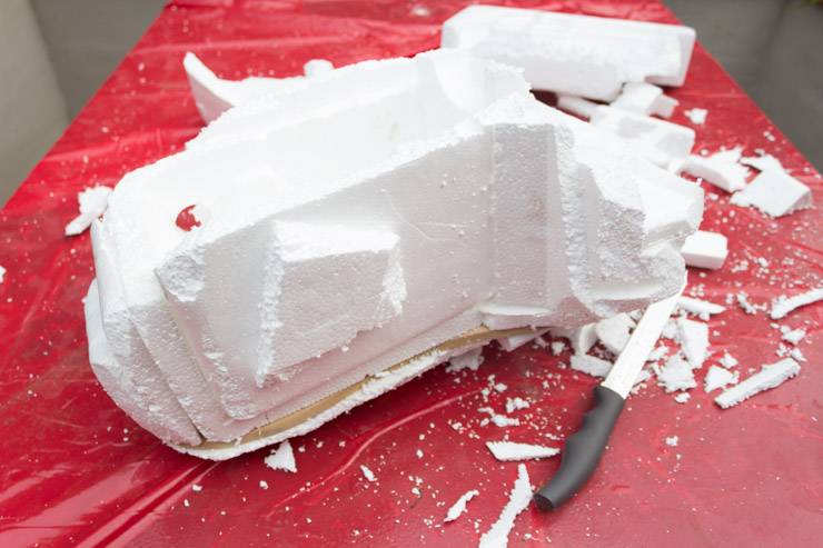 Use a carving knife to neaten up your cloud by rounding off the corners and cutting unnecessary material away, until you've achieved a rough 3D cloud shape. It doesn't really matter how rough this is since we'll be covering everything in stuffing later – you can easily hide mistakes.