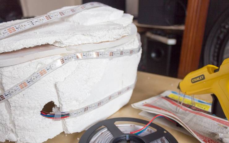 Working slowly, stick the LED pixels to the polystyrene base in a circular pattern, before pulling the strip down to the base to cover the underside. Again - you don't need to be perfect here, because once we've diffused everything and smothered it with stuffing, it all looks rather stunning anyway.