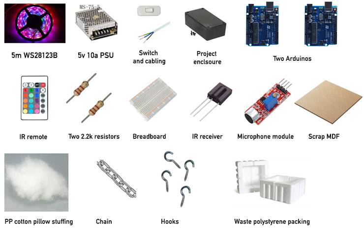 - Two Arduinos. $10 Funduino clones are fine. The second is necessary for remote control, while the first controls the main logic and LEDs.