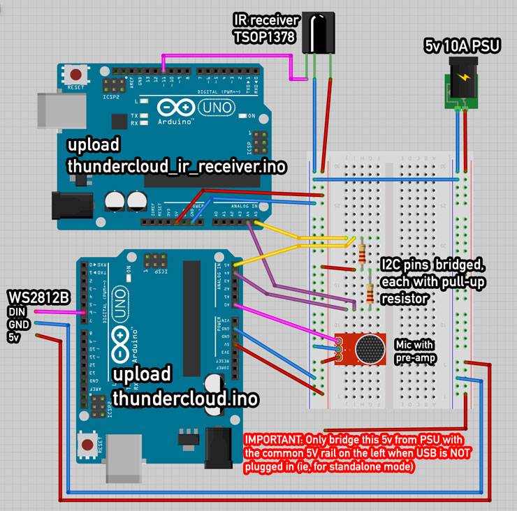 Why two Arduinos? Both the infrared receiver programming and the WS2818B pixel driver library are very sensitive to timing - if the timing is delayed, the IR signal is corrupted. By giving each circuit it's own micro controller and letting them to talk over the I2C protocol, we can ensure timing is perfect on each. You may also find separate IR modules with their own micro controller built-in, but my research found those actually cost more than a simple Arduino clone and IR LED. The thundercloud_ir_receiever shouldn't require explanation, though you may want to read up on I2C basics first.