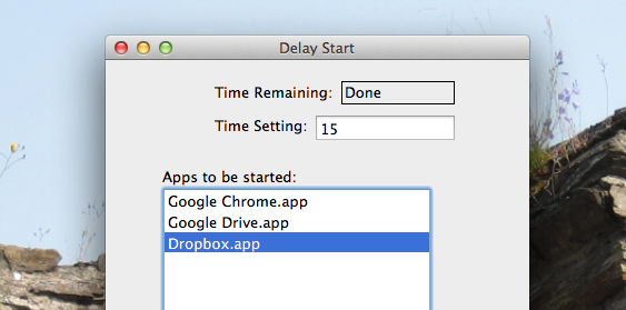 Delay Start is a simple Mac app with a single function - waiting a set amount of time, then starting whatever apps you want. It's simple but it describes the above-mentioned problem. Stop your existing Mac apps from starting at boot – then set Delay Start to do so – and you'll be given a window of time after boot but before your apps load automatically. You set the amount of time in seconds, so be sure to multiple by 60 if you want to delay by a certain number of minutes.