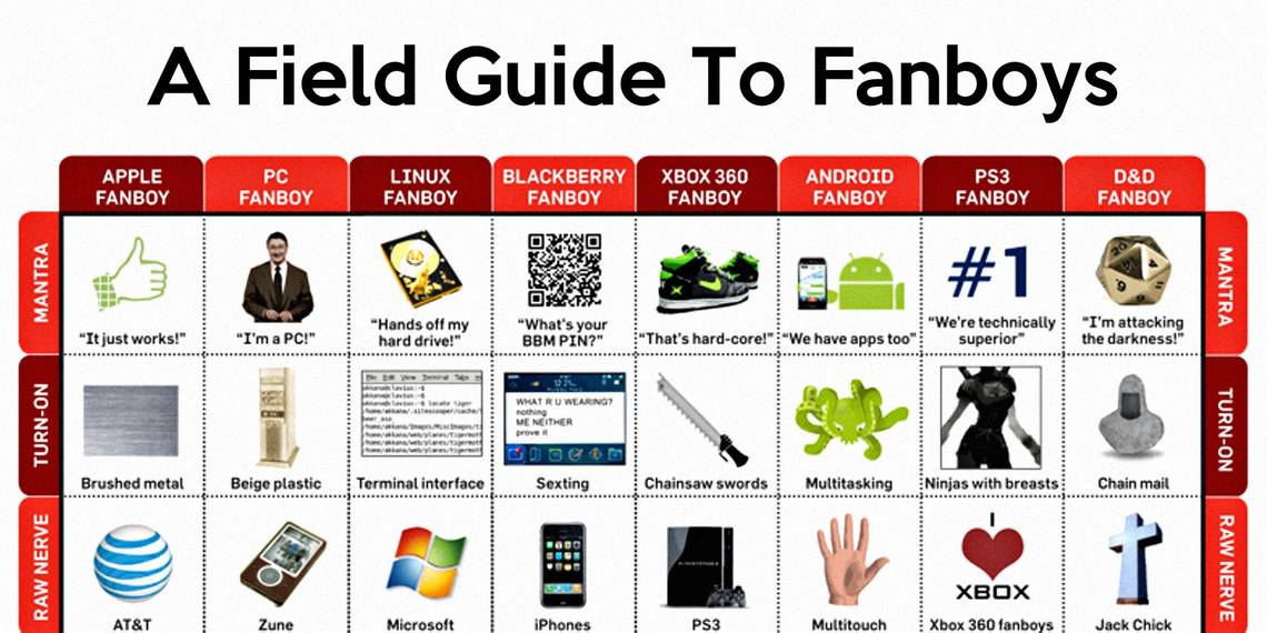 You might have heard of Apple fanboys, and Microsoft fanboys. But there are quite a few other terms in circulation. This guide will teach you to carefully spot them in the wild. Admittedly, it's a little old, but still pretty fun.