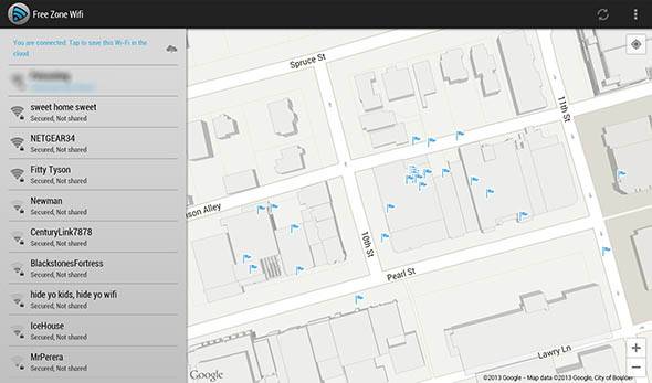 Launch Free WiFi Zone and you'll see a Google Map of your area – assuming you've enabled location services for your device. Flags indicate open and free WiFi access areas, so if there isn't one nearby you know exactly where to go if you need Internet access. Most seem to be in retail areas, surrounding cafes and the like, but there are a few to be found in residential areas as well. If you find a network not on the map you can easily add it, helping other users find it as well.