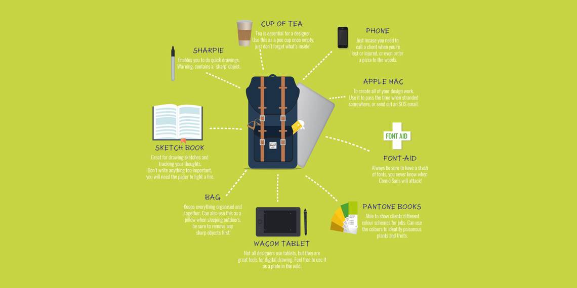 You also need some tools. Every graphics designer has their kit of things they need to be successful at work. Whether it's their phone, computer, or software, there are a few things they all require. Also, as it turns out, while these tools are absolutely necessary for surviving in the design world, they don't help so much out in the wilderness, so leave them at home next time you think you can compete with Survivorman.