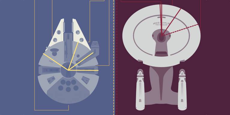Smuggler's spacecraft versus the space voyager. Star Wars versus Star Trek. This is one fan war that will never cease. In spite of the astonishing size difference, is it fair to put the Millenium Falcon, captained by Han Solo, up against the USS Enterprise NCC-1701-D and its crew? How many difference can you spot, and which would win in a fight?