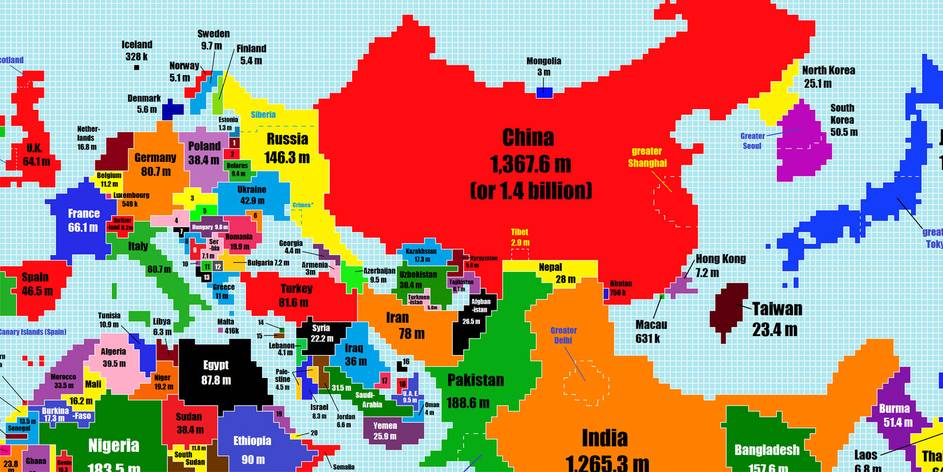 So what if you took the world and scaled each country's size according to its population with each block of land was equal to 500,000 people? Well that's just what this fascinating cartogram does. Check out it, and you might just find that you have a completely different perspective of the Earth.